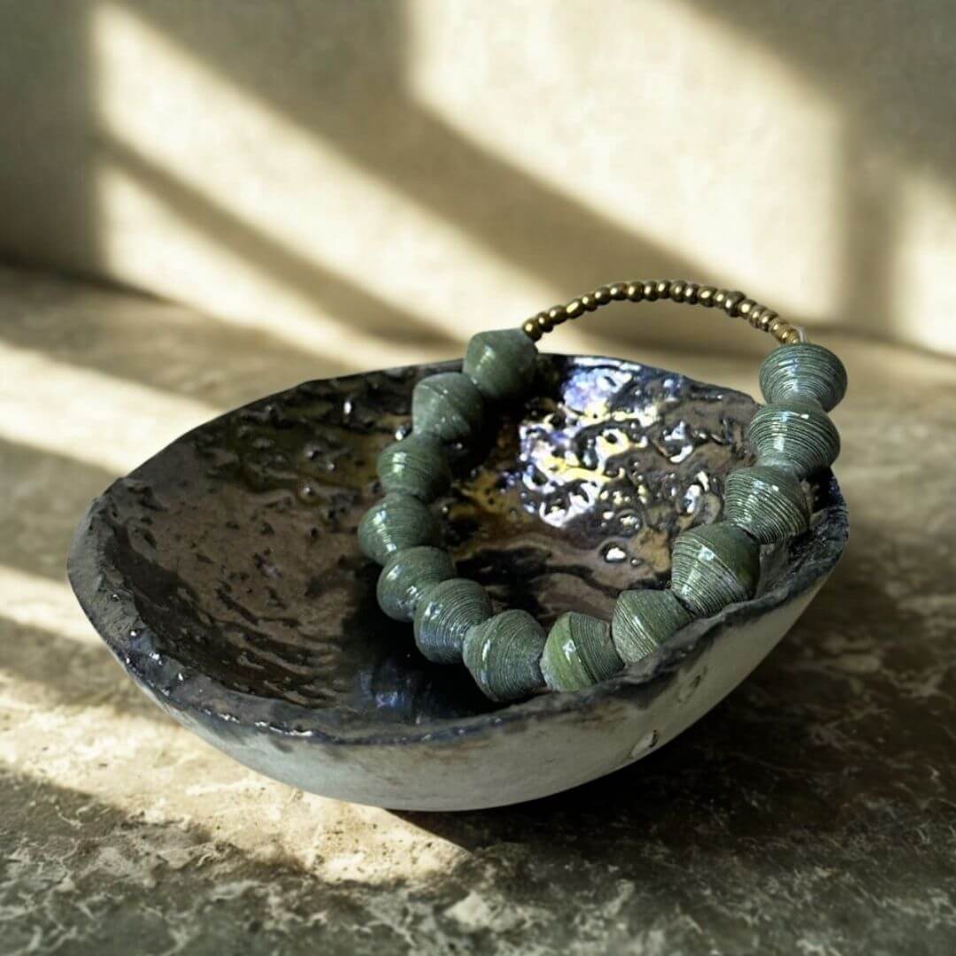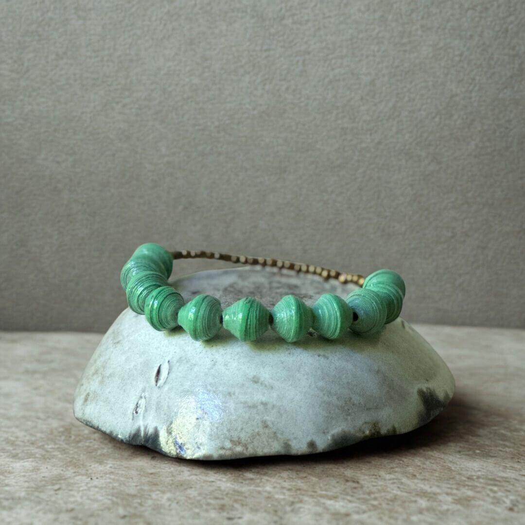 Deze unieke duurzame armband is gemaakt van gerecycled papier. Door strookjes papier strak op te rollen ontstaan de meest mooie kralen. Een proces dat met liefde wordt uitgevoerd door Oegandese grootmoeders die permanent zorgen voor hun kleinkinderen. De inkomsten dragen bij aan een menswaardig en zelfstandig leven.